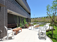 色とりどりの季節の草花を見ながら歩ける、手すりの付いた散歩道をご用意しました。疲れた時にはベンチで一休み、ほっと一息つける場所です。まはえガーデンには園芸用のスペースもあり、夏は2階まで届くグリーンカーテンが涼しげです。車いすに座ったまま楽しめる園芸も大変好評を頂いております。