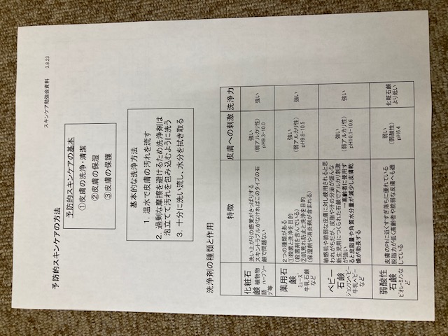 毎月のテーマは様々で、職員が研修で学んだことを伝達したり、制度改正に関する勉強会であったり、感染症対策、看護技術、またはリハビリの実践等、学ぶ機会を設けております。